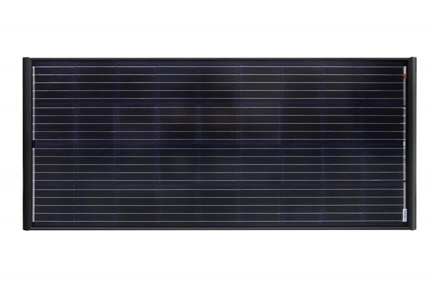 "All black" Monokrystallinsk solcellepanel av meget høy kvalitet. Panelet kommer med fastmontert Aero-spoilere til hver kortende, og 7 meter med fastmontert kabel.